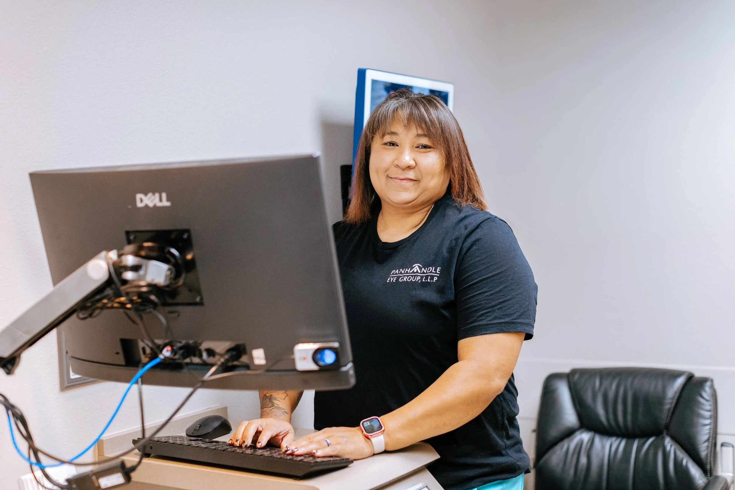 Klorenda still laughs when she thinks about her first day at Panhandle Eye Group 15 years ago. Walking into a packed clinic, she remembers thinking, “What the heck is going on?” It was fast, busy, and a little overwhelming, but something about it felt right. She quickly found her place.